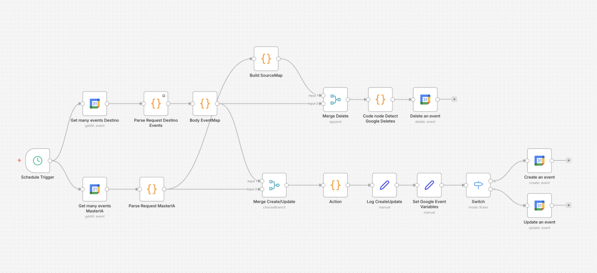 Lo único que tuve que corregir fue la lógica de borrado y actualización. Al principio los flujos no identificaban correctamente los hashes que había establecido al inicio del proceso — los identificadores únicos por evento que permiten reconocerlos entre sistemas. Una vez resuelto eso, el resto fue directo.